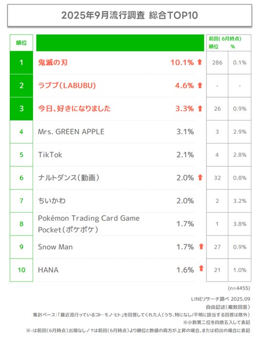 最新若年層トレンド、「鬼滅の刃」が3度目の1位!「ラブブ」が初登場2位、「今日好き」が3位 LINEリサーチ、全国の15~24歳の男女を対象に、流行に関する調査を実施