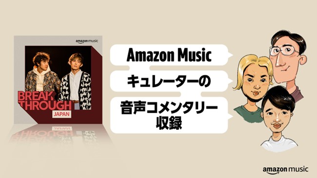 今回、「BREAKTHROUGH JAPAN」をより一層お楽しみいただくべく、新たなコンテンツとして、Amazon Musicキュレーター陣による音声コメンタリーを収録した「Inside Breakthrough」を同プレイリストに追加します。「Inside Breakthrough」では、新人アーティストを発掘しつつプレイリストの楽曲選定を行うAmazon Musicキュレーター3名が、特に感銘を受けた新人アーティストや楽曲の魅力について独自の視点で解説するほか、選定の想いについて語り合います。