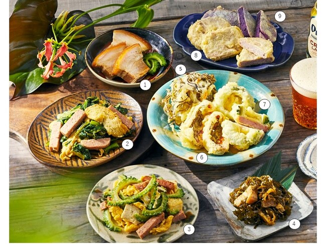 「椛(もみじ)弁当」2.フーチキナーチャンプルー 3.ゴーヤーチャンプルー 4.クーブイリチー (100gあたり)各540円