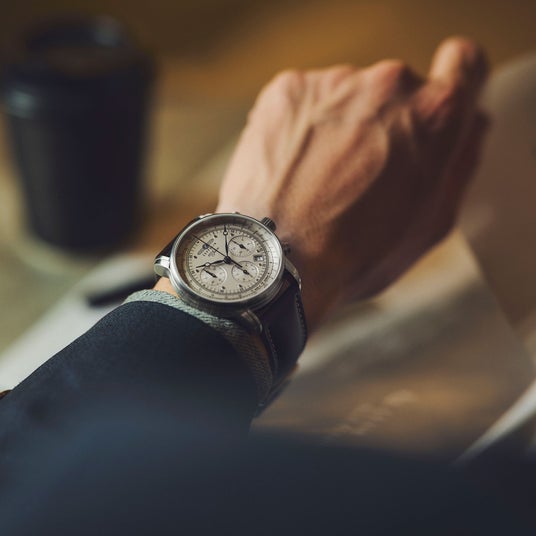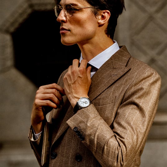 また、3カウンターのクロノグラフでありながら、けっして大ぶりではない42mmのケース径を採用。インダイヤルもコンパクトにまとまっており、スーツやジャケットと合わせたフォーマルな装いにもマッチします。