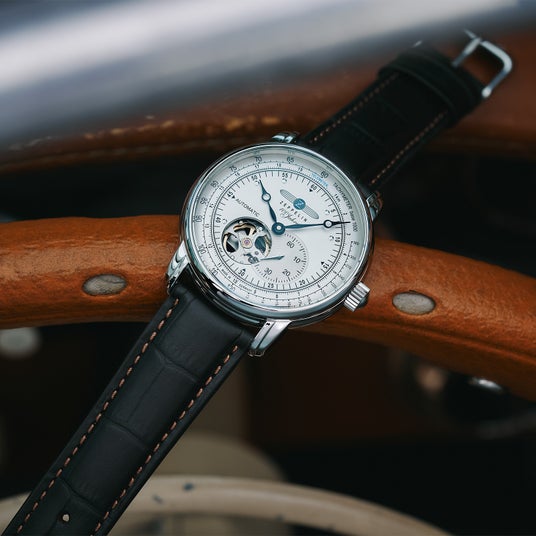 100周年記念モデルは、そんな飛行船の機体をソースとしてデザイン。硬式飛行船の機体を支える構造をイメージし、柔らかなアーチを描いたボンベダイヤルや飛行船型ケース、ドームガラスの風防が特徴です。また、気体を装填する船の構造体を輪切りにしたようなインジケーター表示でも世界観を表現。空輸の時代を創造したツェッペリン飛行船と、その輝かしい技術革命に邁進したドイツの職人のクラフトマンシップを体現しています。