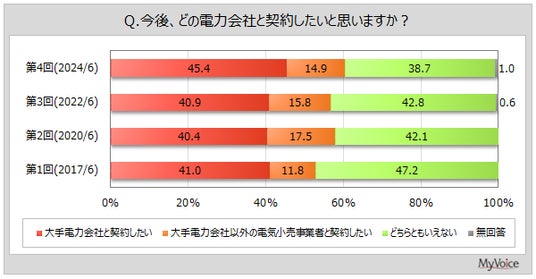 今後の電力会社の契約意向は、「大手電力会社と契約したい」が45.4%で、2022年調査と比べて増加しています。
