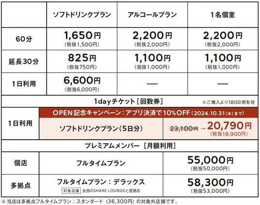 ■「銀座 蔦屋書店 SHARE LOUNGE」料金表