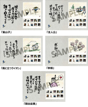 これまでに発表された574曲を対象に、「心に残る名曲を選ぶ投票」を実施。選ばれた上位5曲(1位:案山子、2位:主人公、3位:風に立つライオン、4位:秋桜、5位:関白宣言)をモチーフに、さださんが新たに描き下ろしたイラストを、台紙に使用した特別なオリジナル・フレーム切手です。