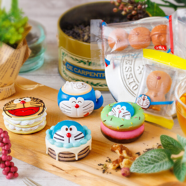 ドラえもんをイメージし、甘い食べ物や菓子パンをモチーフにした、思わずお腹が空いてきそうなデザインのマグネットです。全6種のアイテムはいずれも全高3~5cm程の手のひらサイズで、フィギュアとしてお気に入りのスペースに置いたり、冷蔵庫にちょっとしたメモを止めるのに使用したりと、使い方は様々です。ブラインドパッケージ仕様のため、どれがでるかは箱を開けてからのお楽しみです。