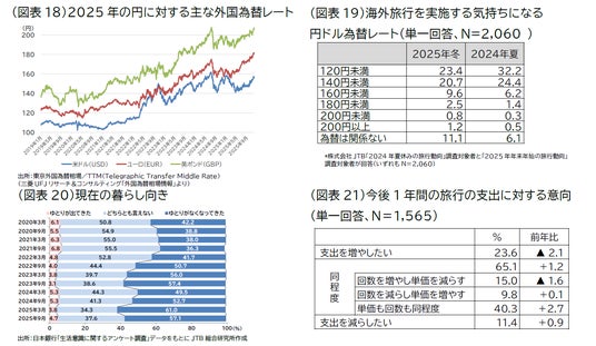 足元の経済状況をみると、円ドルの為替レートは2019年は110円前後で推移していましたが、その後円安・ドル高が進みました。2025年も継続しており、4月には140円台前半まで戻したものの、12月には155円前後で推移しています。(図表18)。また 「海外旅行を実施する気持ちになる円ドル為替レート」について、国内旅行予定者を含む、2024年夏休み旅行予定者と2025年年末年始旅行予定者に聞いた結果を比較したところ、「120円未満」は8.8ポイントの減少、「140円未満」は3.7ポイント減少し、140円以上の合計は5.5ポイント増加しました。また「為替に関係なく海外旅行を検討する」も5.0ポイント増加し、円安への受容が進んでいる様子も見受けられます(図表19)。日本銀行が実施している「生活意識に関するアンケート調査」の「現在の暮らし向き」をみると、2025年9月は「ゆとりが出てきた」の割合が上昇し、「現在の暮らし向き」の値はやや改善しましたが、まだ2021年以前の水準には戻っていません(図表20)。また、前述のアンケート調査において「旅行に行く」と答えた人に、「今後1年間の旅行の支出に対する意向」を聞いたところ、「支出を増やしたい(23.6%)」が「支出を減らしたい(11.4%)を上回っています。(図表21)。