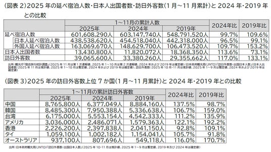 国内旅行について、2025年は国内の経済状況や物価高騰などの影響により、宿泊者数は伸び悩みとなっています。2025年の延べ宿泊者数をみると、1~11月の累計は4億3,854万人泊で、2024年同期(4億5,452万人泊)と比べると96.5%となっています(図表2)。