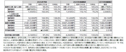 JTBは、2026年の旅行動向見通しをまとめました。当調査は、1泊以上の日本人の旅行(ビジネス・帰省を含む)と訪日外国人旅行について、各種経済指標や消費者行動調査、運輸・観光関連データ、JTBグループが実施したアンケート調査などから推計したもので、1981年から継続的に調査を実施しています。2026年の調査結果は、次のとおりです。