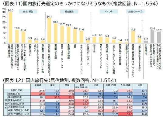 国内旅行を実施すると答えた人に対し、旅行先を決めるきっかけになりそうなものを聞いたところ、「自然が楽しめる場所(国立公園や花畑など)」が30.0%と最も高く、「寺社仏閣、史跡などの歴史スポット」が24.1%と続きました。性年代別でみると、男性70代と女性60~70代で「自然が楽しめる場所(国立公園や花畑など)」が人気で、20~30代は男女ともに、動物園や水族館、テーマパークなどの割合が高くなりました(図表11)。また自由回答では2025年に開業した「JUNGLIA OKINAWA」や、新エリアが誕生したハウステンボス、人気映画の影響で歌舞伎などが注目されていることがわかりました。