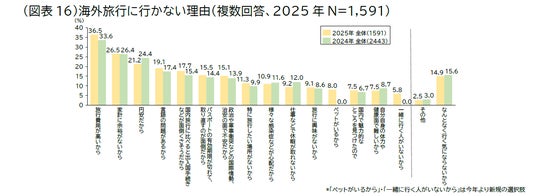 海外旅行に「一度も行かない」と答えた人は77.0%で、国内旅行同様に経済的な理由が上位になりましたが、海外旅行では「旅行費用が高いから(36.5%)」、次いで「家計に余裕がないから (26.5%)」となり、国内旅行とは順位が逆転しています。3位の「円安だから(21.2%)」は前年より3.2ポイント減少しました。経済的な理由以外には、「言語の問題」や「出入国手続きが面倒くさそう」、「パスポートを取り直すのが面倒」など心理的な要因がハードルとなっているようです(図表16)。