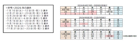2026年は3連休以上が8回(3連休6回、5連休2回)あります。2025年の9回(3連休8回、4連休1回)と比べ、回数としては1回の減少ですが、GW(5月2日(土)~6日(水))とシルバーウィーク(9月19日(土)~23日(水・祝))に5連休があり、夏休みは、8月10日(月)を休むと8月8日(土)~11日(火)が4連休。2026年~2027年の年末年始は、12月28日(月)~31日(木)を休めば12月26日(土)~1月3日(日)の9連休となり、2025年と比較すると大型連休が多い年と言えます。
