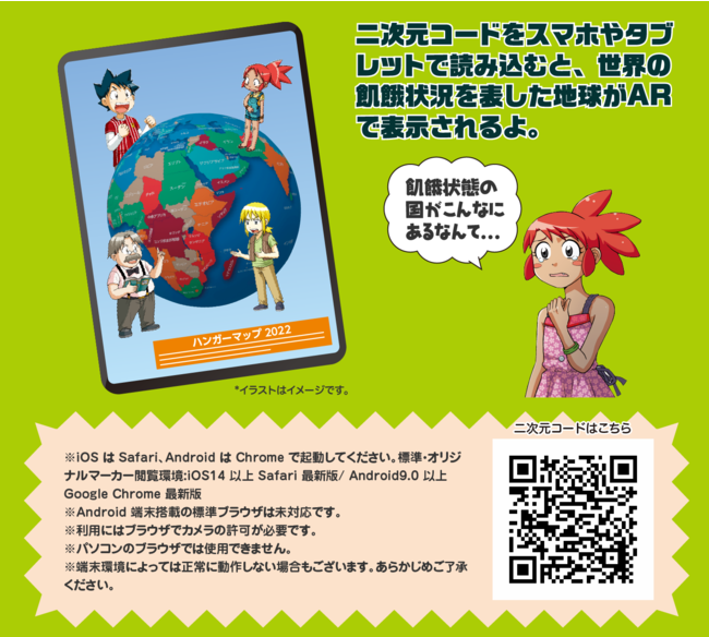 二次元コードをスマホやタブレットで読み込むと、世界の飢餓状況を表した地球がARで表示されます。ジオ、ピピ、ケイ、ノウ博士などキャラクターたちのコメントも要チェック!