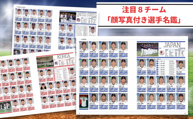共に闘いWBCを盛り上げた主要8カ国(日本、アメリカ、プエルトリコ、ドミニカ共和国、オランダ、ベネズエラ、韓国、キューバ)の「顔写真付き選手名鑑」ページ付き。各国の過去大会の成績や国の基本情報も掲載しています。