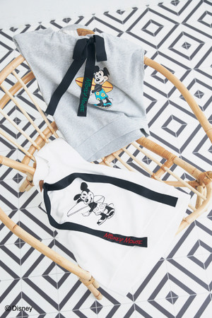 サーフボードを楽しむミッキーマウスがプリントされたノースリーブ仕様の変形スウェット。