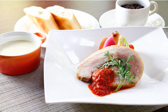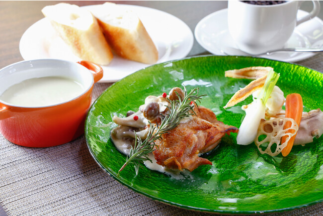 上記メニューには契約農家さんから届いた山梨県産安納芋のポタージュとドリンクがセットで付きます。