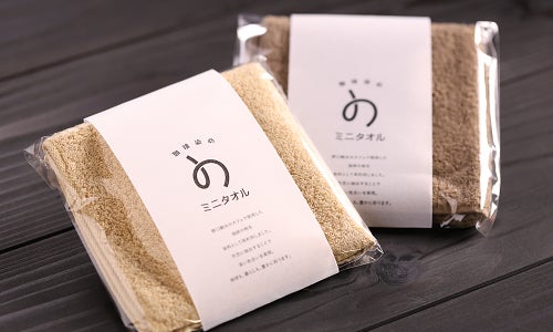 ◆ 珈琲染めのミニタオル(¥2,200)ホテルカフェで出たコーヒーカスを再利用した、環境にやさしいエコアイテム。ナチュラルな風合いも魅力です。