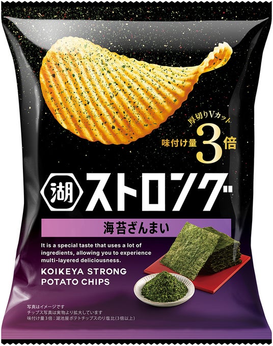 さらに、リニューアルを象徴する新フレーバーとして、湖池屋を代表する“海苔(のり)”をテーマにした、湖池屋商品No.1ののり量を使用した「湖池屋ストロング 海苔ざんまい」を発売します。
