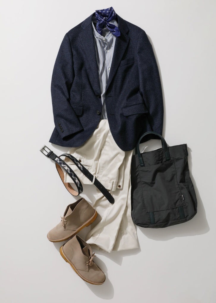 ブルーのスタンドカラーシャツとアイボリーのチノパンが織りなすのは、軽やかで洗練されたコントラスト。温もりのある素材感に、清涼なトーンを重ねることで、自然体の中にも上品さが漂います。リラックスしながらも品よく魅せる、大人の週末スタイルに。