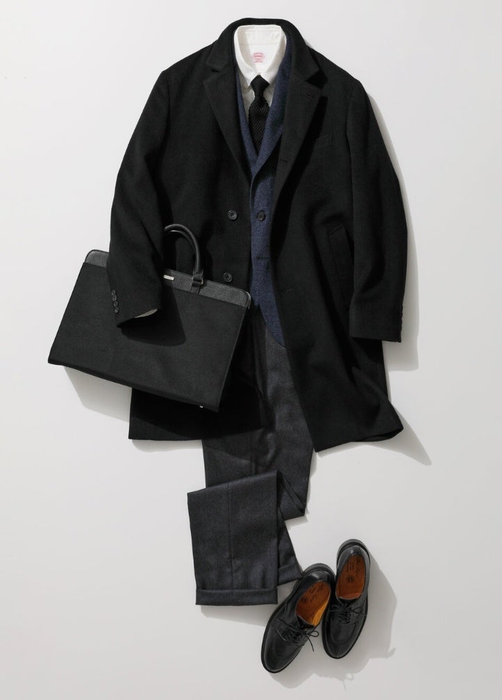 主張しすぎない気品とカシミヤ特有の軽やかさが調和し、控えめでありながら、確かな品格を感じさせる組み合わせは、上質を知る大人にこそふさわしい冬のビジネススタイルです。