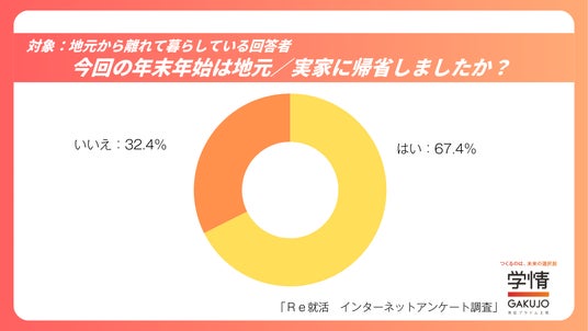 現在、地元から離れて暮らしていると回答した人は32.5%でした。そのうち、今回の年末年始に地元や実家へ帰省した人は67.4%となっています。一方、全体の67.5%は地元で生活していると回答しました。
