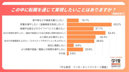 転職を通じて実現したいこととして最も多かったのは、「貯蓄を増やしたい(金融資産を形成したい)」(63.2%)でした。次いで、「自分の時間を増やしたい(趣味や勉強などの自己実現に時間を割きたい)」(54.4%)、「より誇れる仕事がしたい」(40.4%)が挙げられました。