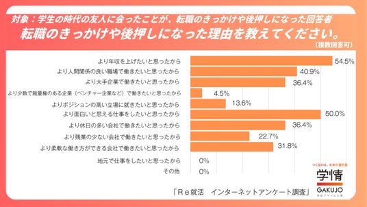 転職のきっかけや後押しになった理由として、最も多かったのは「より年収を上げたいと思ったから」(54.5%)でした。次いで、「より面白いと思える仕事をしたいと思ったから」(50.0%)、「より人間関係の良い職場で働きたいと思ったから」(40.9%)が続きました。