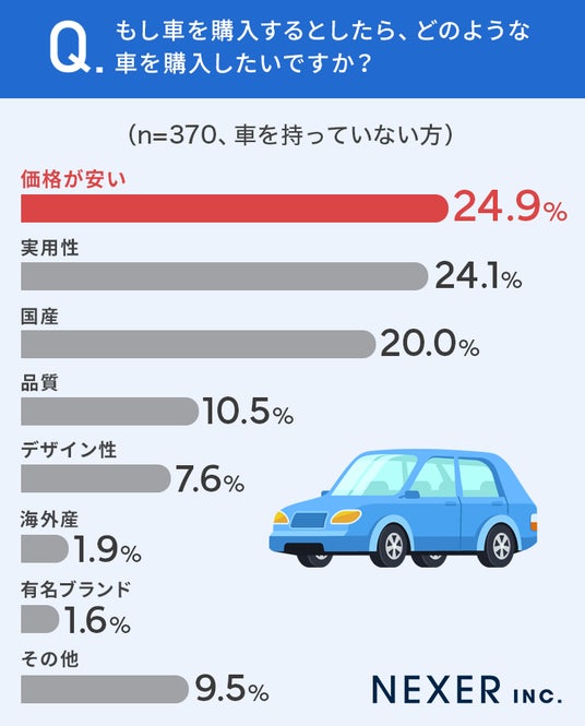現在車を所有している方とは異なり、24.9%で「価格が安い」がもっとも多い結果になりました。