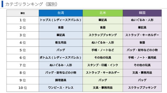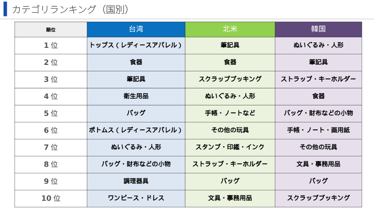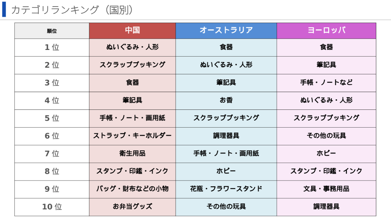■人気商品ランキング(国別)では、各国共通で「食器」と「筆記具」が上位ランクイン