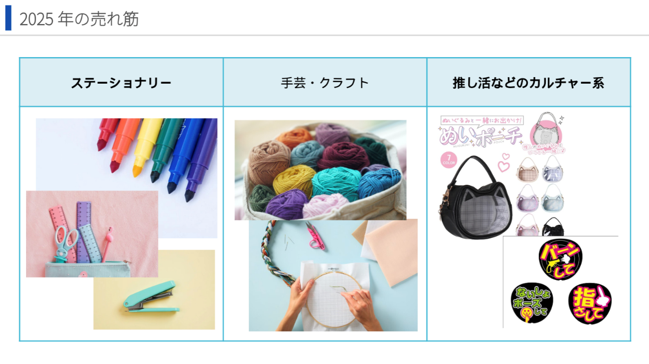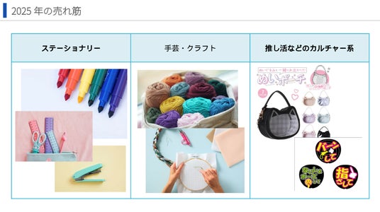 SD exportでは、「ステーショナリー」「手芸クラフト」「推し活などカルチャー系商品」の3つのジャンルに注目が集まりました。ステーショナリーでは、高機能な筆記具に加え、「シール」「マスキングテープ」など手帳やノートを彩るデザイン性の高いアイテムの需要が拡大しました。手芸クラフトは、購入会員数が前年比13.6%増、売上が7.6%増と堅調に成長。デニムリペアをきっかけとした日本の「刺し子(SASHIKO)」ブームや、SNS発の「ブーケブランケット」の流行により、「糸・毛糸」カテゴリは前年比52.4%増を記録しました。SNSトレンドが実売に直結していることがデータで示されています。