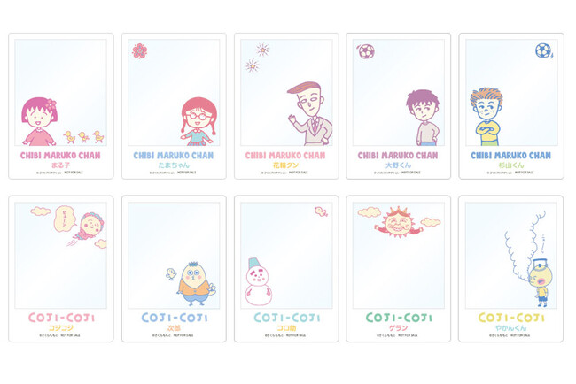 また、お買い上げ特典として、2,500円(税込)ご購入ごとに、「ちびまる子ちゃん」や「コジコジ」の仲間たちと写真撮影ができるフレーム「ちびまる子ちゃん・コジコジクリアPHOTOカード」(全10種・非売品)をプレゼントいたします。