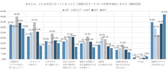 全体では「退職代行サービスは利用しない」が最も多く34.8%、次いで「人間関係のトラブルがあり、言い出しにくい」が32.3%、「ハラスメントを受けた」が21.3%となった。「退職の意思を誰に伝えるのかわからない」は8.7%だった。上司と部下など、職場で交流があまりない・普段からコミュニケーションをとれていない場合、このようなケースが増えるかもしれない。