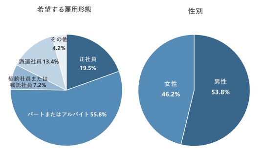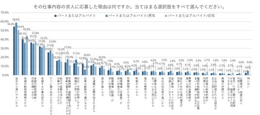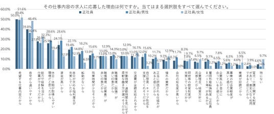 一方、「女性」のほうが「男性」よりも「扶養の範囲内で働けるから」が12.7pt、「希望の勤務時間帯だから」が8.0pt高くなった。時間や収入の制限がある中でもできる仕事が選ばれやすそうだ。