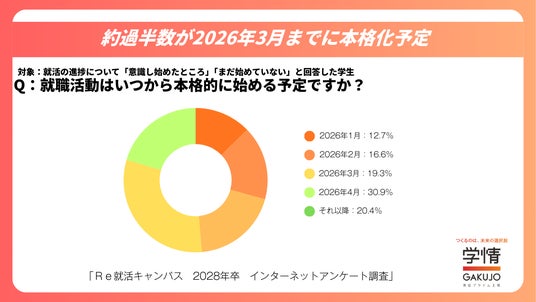 就職活動の進捗について「意識し始めたところ」「まだ始めていない」と回答した学生を対象に、就職活動をいつから本格的に始める予定かを聞きました。その結果、「2026年4月から」が30.9%で最も多く、次いで「2026年3月から」が19.3%、「2026年2月から」が16.6%となりました。