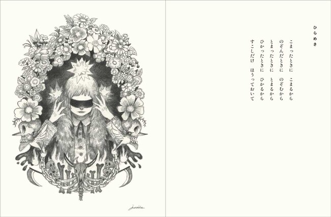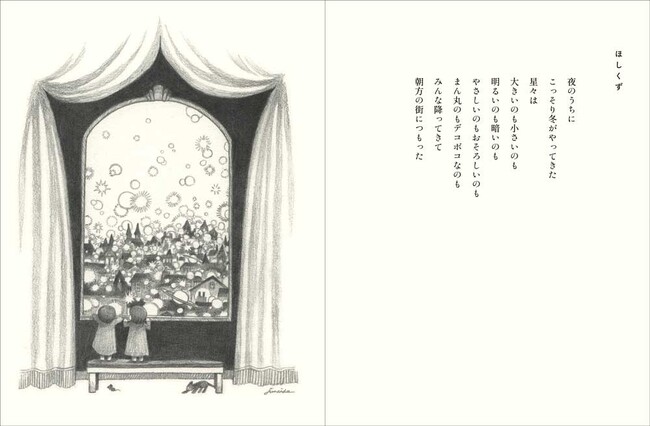 『ともしび』は、見開きにひとつの画と詩を納めた構成になっています。言葉にできない何かを画にしてきた作家の紡いだ言葉は朗々とした語りではなく、小さなささやきでした。鉛筆の画に添えられた言葉はどことなく不器用だからこそ、新しい魅力を放っています。このともしびを掲げて、junaida作品は新たな道を歩き出したのかもしれません。この作品で初の原画展を開催できることは私たちにとっても特別な機会です。