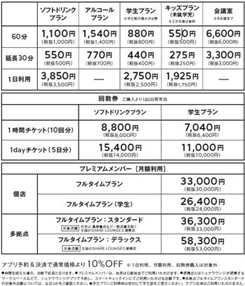 SHARE LOUNGE Olive LOUNGE下高井戸 料金表