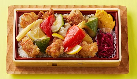 さっぱりレモン風味おこわに唐揚げなどをトッピングしたお重