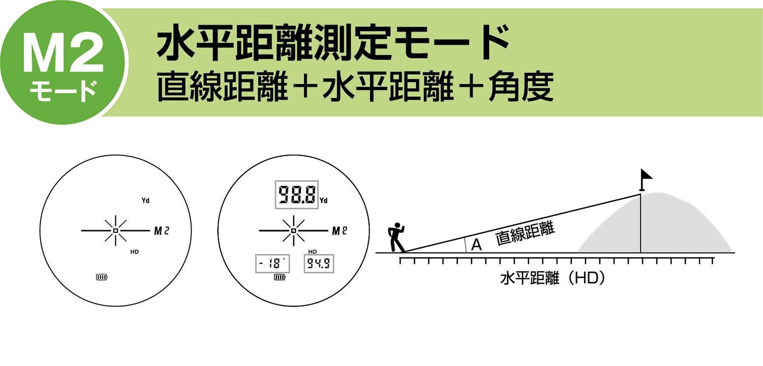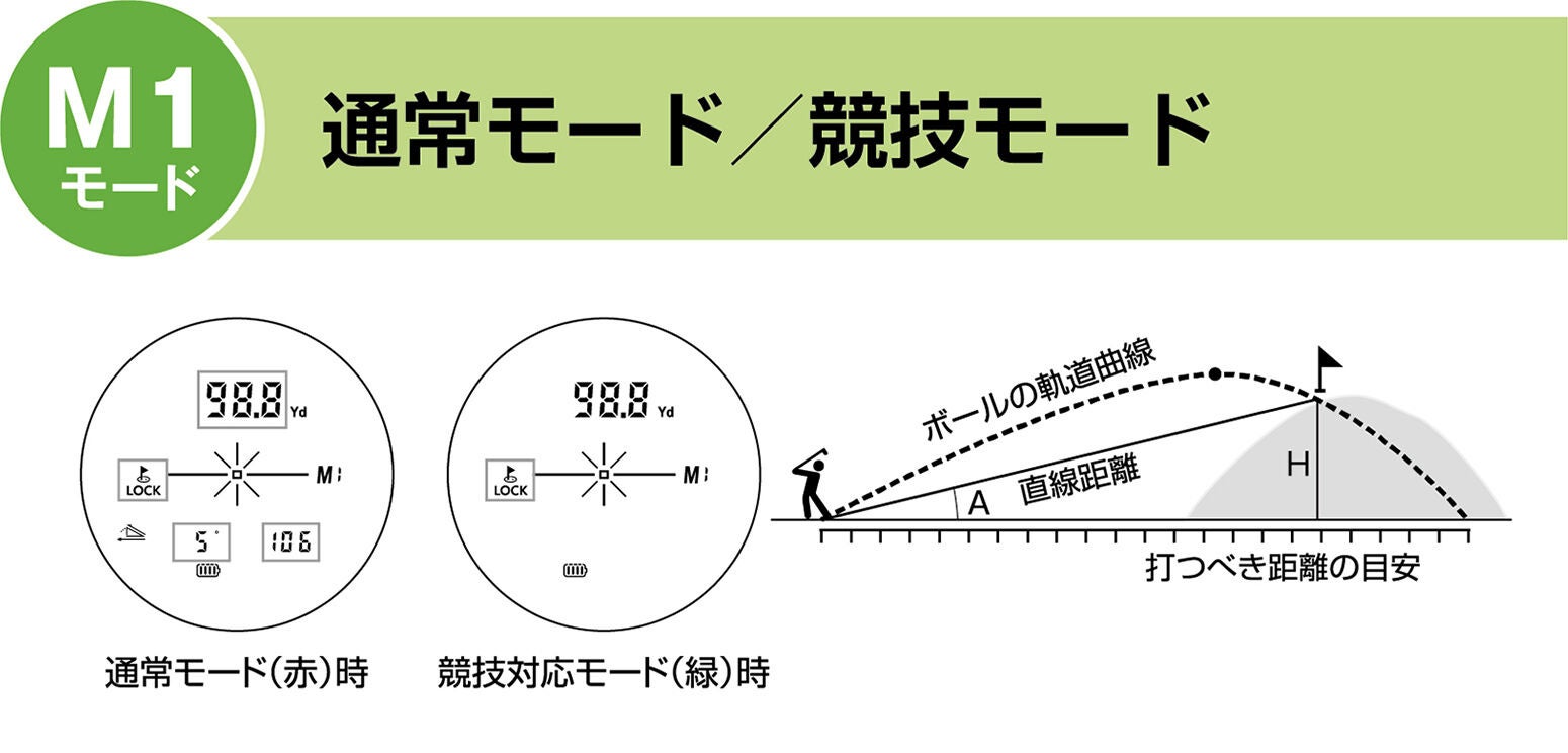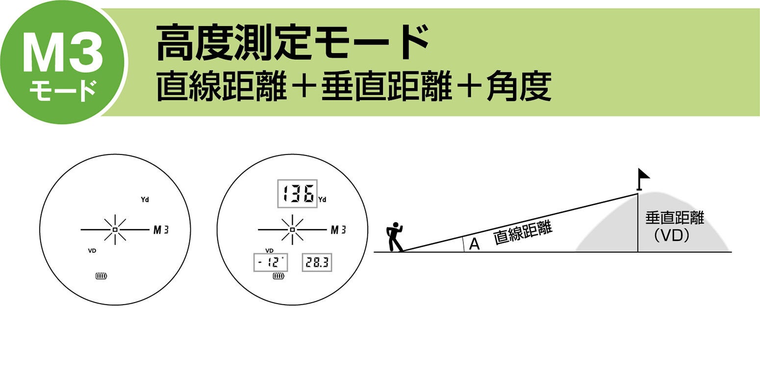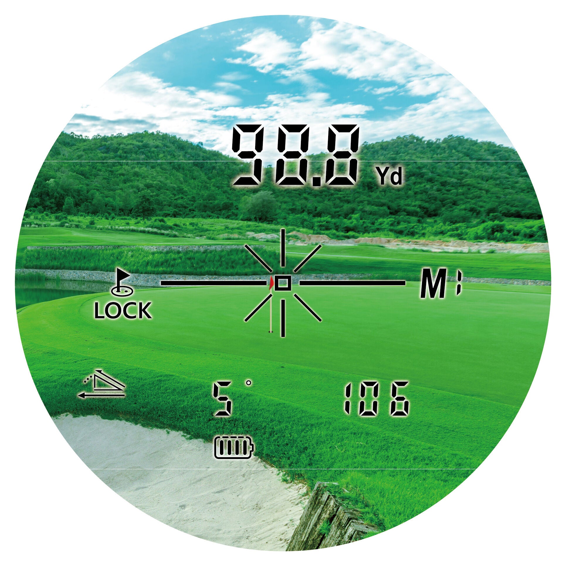 最大1000m先までの距離が計測可能なゴルフ用レーザー距離計。計測ボタンを軽く押すだけで瞬時に距離を測れます。直線距離に加え、高低差をふまえた打つべき距離の目安、角度を計測できます。また目的に応じて競技モードに切り替え可能。