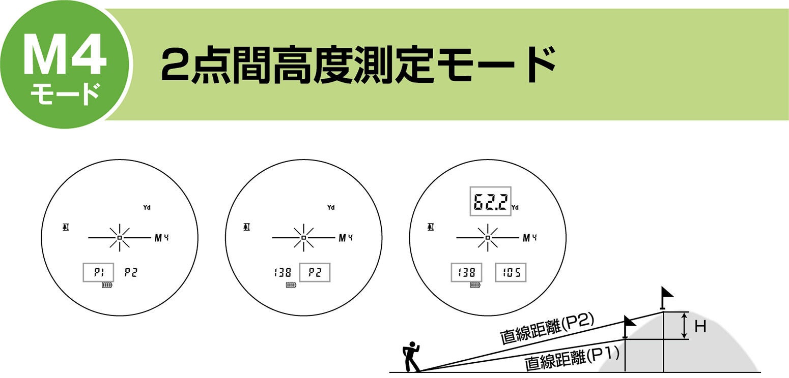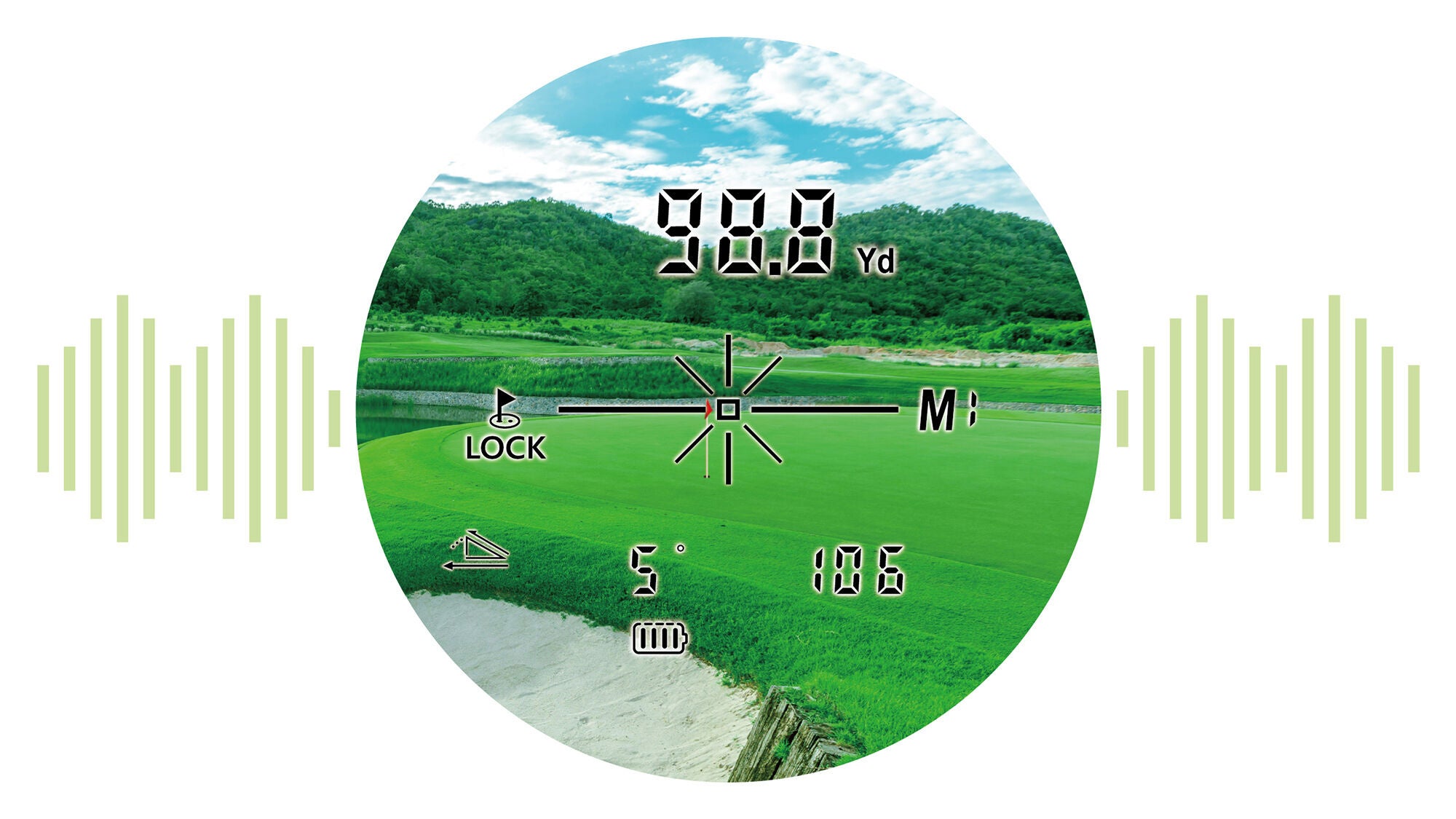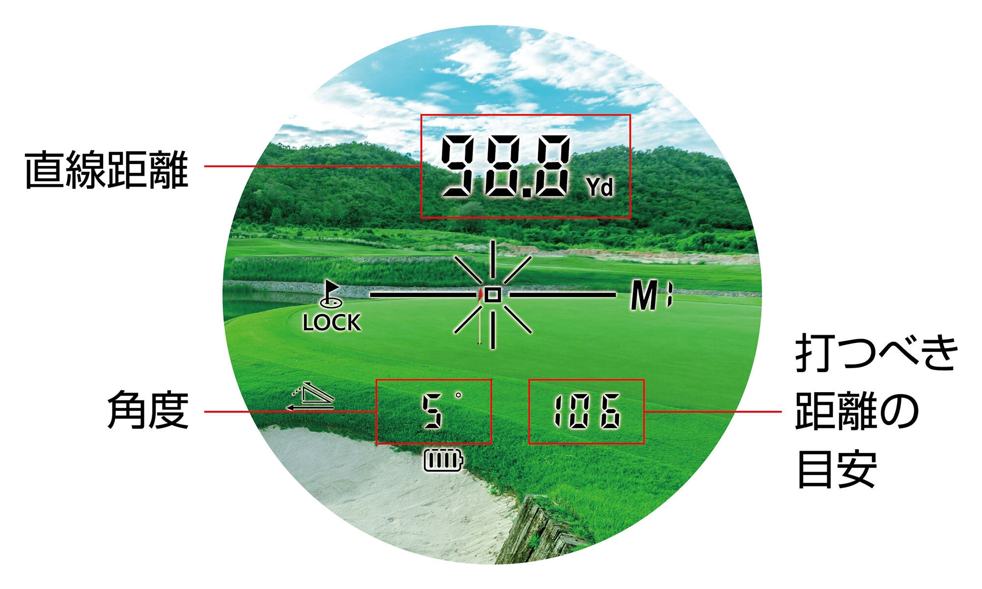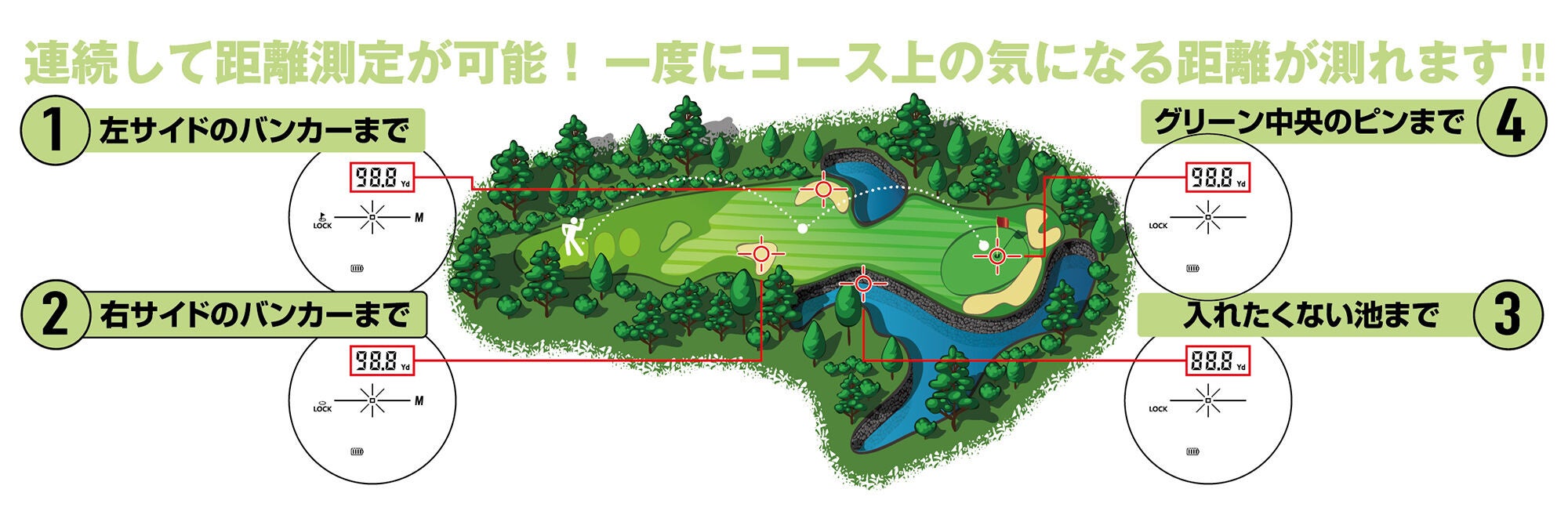 計測ボタンを押し続けると連続距離測定が可能です。池やバンカーの手前と奥までの距離を一気に測れるので便利です。ボタンを押しっぱなしで測定できるので手ブレを軽減できます。