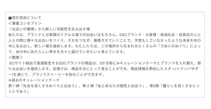 「明日見世(asumise)」では、<Social good/サステナブル、地域貢献など><Essential beauty/プロダクトのストーリーや美しさ・機能美など><Breaking stereotypes/固定観念から脱却できるような商品背景など>の3つの選定ポイントを満たすブランドを今後も展開してまいります。