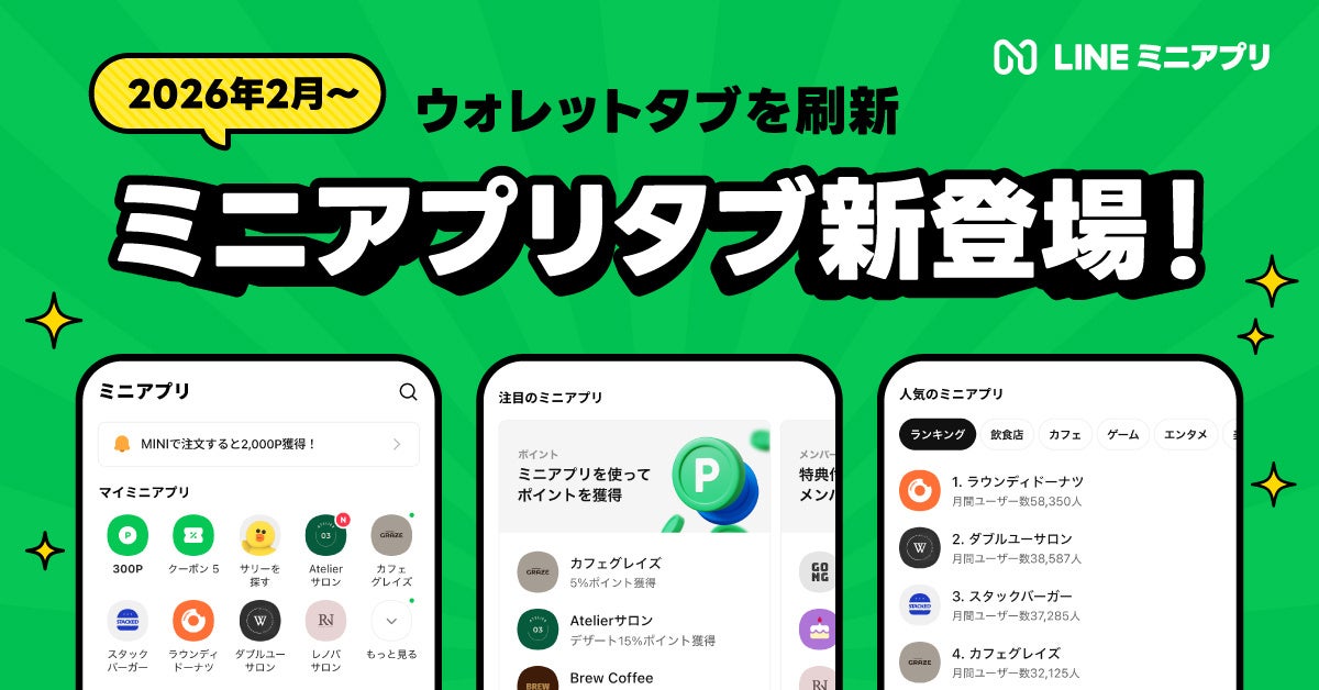 LINEヤフー株式会社(以下、LINEヤフー)は、コミュニケーションアプリ「LINE」は、2026年2月頃より「ウォレットタブ」を刷新し、「ミニアプリタブ」として提供を開始します。