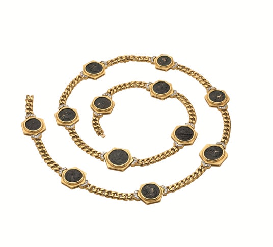 古代ギリシャのブロンズ コインとダイヤモンドがセットされたゴールド チェーンの「モネーテ コンバーチブル」ソートワール ネックレス(1978年 製作)