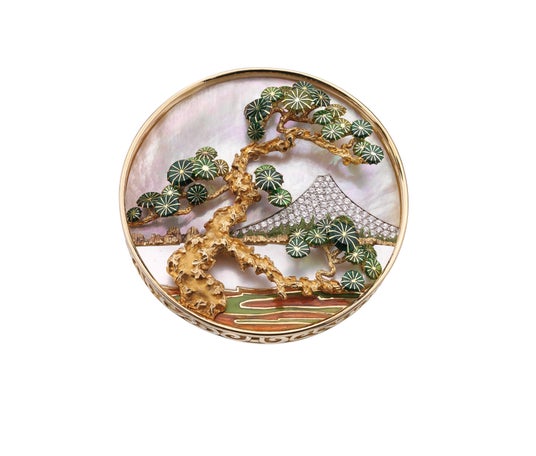 マザー・オブ・パール、ポリクローム エナメル、そしてダイヤモンドがあしらわれたゴールド製の「マウント フジ」ブローチ(1972年 製作)