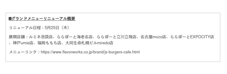 公式HP :http://www.flavorworks.co.jp/brand/js-burgers-cafe.html