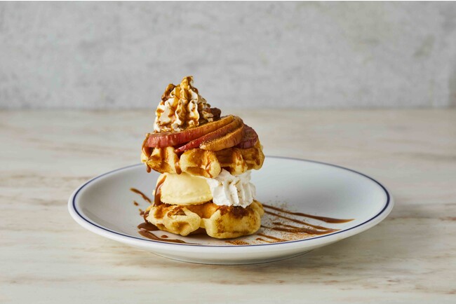 さらに、アメリカの代表的なデザートをイメージした「キャラメル&アップルシナモンワッフル」はバターが香るワッフルにシナモンをアクセントにしたアップルキャラメリゼをトッピング。濃厚なキャラメルソースとナッツの食感で甘いもの好きにはたまらない商品です。