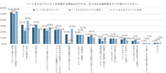 求人に応募した、パートまたはアルバイトを希望する人に、なぜその雇用形態を希望するのかをきいた(複数回答)。最も多かったのは「自分の都合のよい時間や曜日に働きたいから」で52.6%、次いで「生活との両立を図りたいから」が32.1%、「気楽に働きたいから」が27.3%となった。