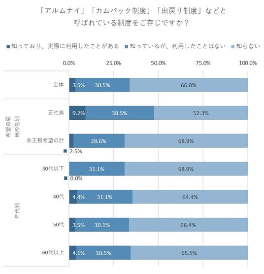 求人に応募した人に、「アルムナイ」「カムバック制度」「出戻り制度」といった、一度退職した従業員を再度採用する制度に関して知っているかをきいた。全体では、「知っており、実際に利用したことがある」は3.5%、「知っているが、利用したことはない」は30.5%、「知らない」は66.0%となった。近年は耳にする機会も増えたが、全体での認知は高くなく、利用したことがある人も少ないようだ。