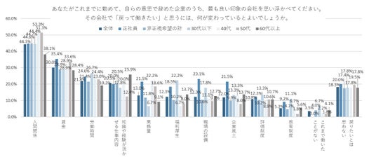 年代別にみると、「40代」「50代」の半数が「人間関係」を選択した。上司や部下との調整が求められやすい年代でもあるため、負担が大きくなってしまうこともありそうだ。「60代以上」では「知識や経験が活かせる仕事内容」が25.9%となり、他の年代と差がついた。定年再雇用に該当する人も多いので、現役世代だけでなくシニア層においてもアルムナイ採用のニーズがありそうだ。