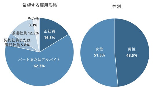 一方、「女性」のほうが「男性」よりも「将来にわたって安定して働きたいから」が32.1pt、「他の雇用形態より収入が得られると思うから」が12.9pt、「自身のキャリアを維持・向上したいから」が6.4pt高くなった。とくに安定に重きを置いている割合が高く、女性正社員希望者の9割弱は継続した雇用を意識して正社員を希望しているようだ。