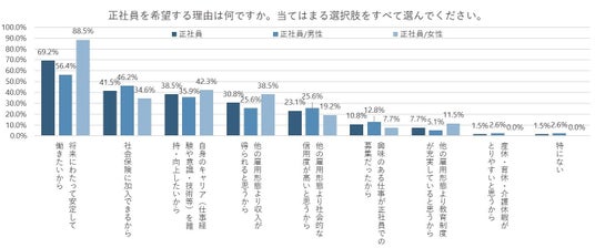 「将来にわたって安定して働きたいから」69.2%、「社会保険に加入できるからが41.5%、「自身のキャリア(仕事経験や意識・技術等)を維持・向上したいから」38.5%