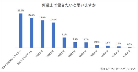 「何歳まで働きたいと思いますか」という質問をしたところ、「できれば仕事はしたくない(23.6%)」が1位である一方で、一般的な“定年”とされる「60歳まで(17.4%)」、「65歳まで(18.9%)」を押さえ、「働けるうちはずっと(20.6%)」が2位にランクイン。“人生100年時代”と言われる現代において、将来にわたり働く意向のある30代の姿が明らかになりました。